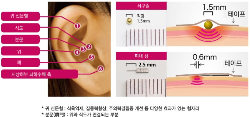 일본의 한 연구진에 따르면, 귓바퀴(外耳)에 한방 침술을 시행하면 체중을 감량시키고, 식욕을 억제하며 체질량 지수를 낮출 수 있다고 합니다. 다만, 이 연구에서 사용된 침술은 바늘을 사용하지 않았습니다. 대신, 작은 금속 알갱이를 수술용 테이프에 붙여 귓바퀴 혈자리에 부착하는 방식으로 이루어졌습니다.